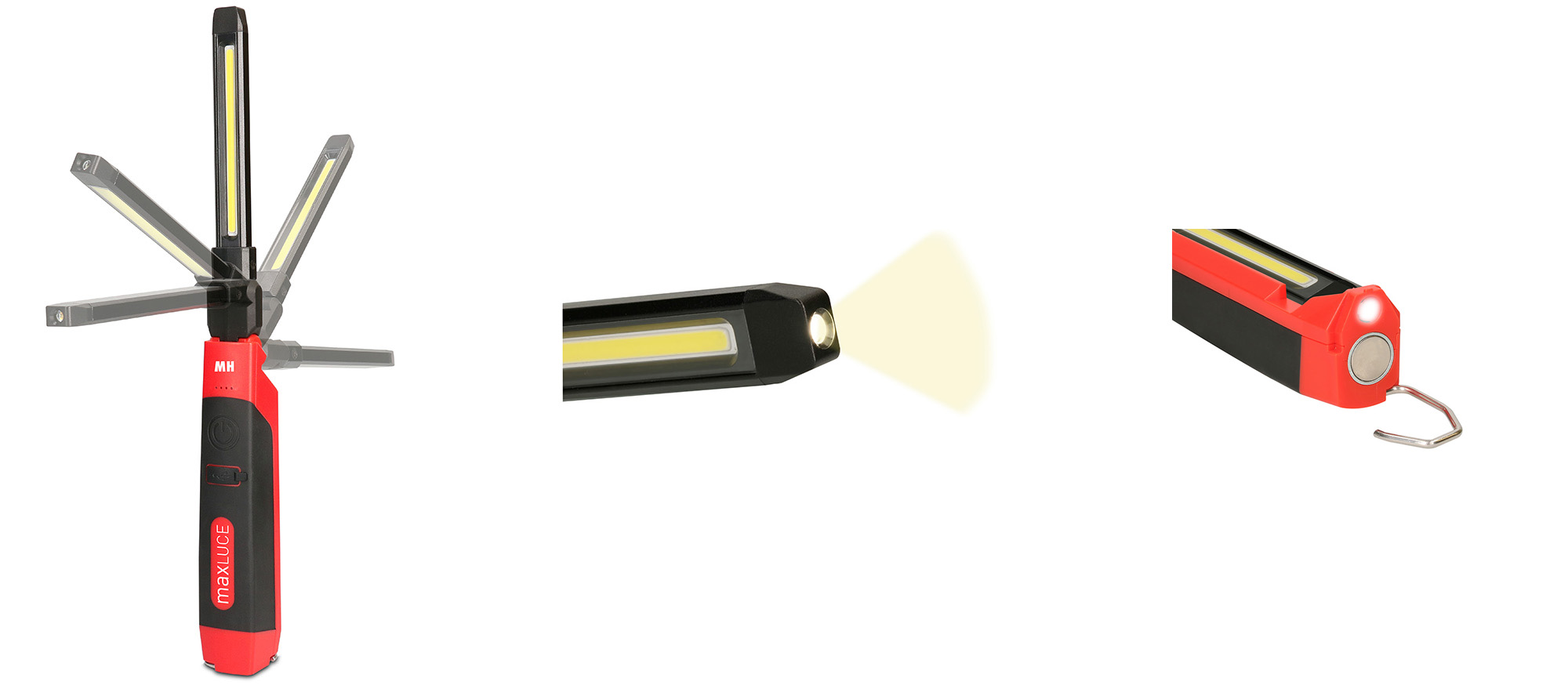 Die maxLUCE Akku LED Handleuchte TURNLIGHT – ein Multitalent, wenn es um Ausleuchtung in engsten Räumen geht. Durch die schmale Bauweise und die zusätzliche Taschenlampenfunktion erreichen Sie auch die hintersten Winkel im Motorenraum oder Schaltschrank. Das robuste Gehäuse mit der gummierten Oberfläche bietet optimalen Griff und Schutz gegenüber mechanischen Beanspruchungen. Mit Hilfe des starken Magneten und des ausklappbaren Aufhängehakens lässt sich die Handleuchte flexibel einsetzen und sorgt so für freie Hände bei der Arbeit.